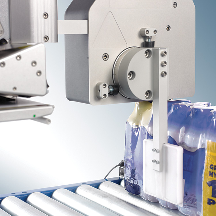 Labelapplicatie op verpakkingen omwikkeld met krimpfolie, zoals multipacks en gebundelde producten.